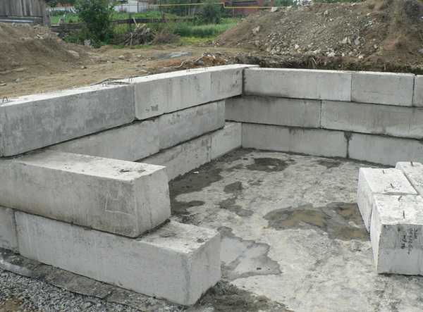 Ленточный фундамент из блоков также устанавливается на песчаную подушку. Кладка блоков осуществляется с мест пересечения углов и стен — так называемых «маячков». Установка первого ряда сопровождается проверкой правильности монтажа с помощью натянутых между маячными блоками веревкой. Для надежности блоки покрываются битумной мастикой или слоем гидроизоляции. Удобство выполнения работ обеспечивается путем нанесения отметок на «подушках» для мест стеновых элементов до начала установки следующего ряда из стандартных (прямоугольных) блоков.