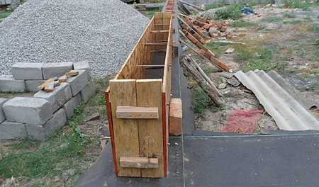При таком подходе кроме экономии пиломатериалов мы также сэкономим на использовании автотранспорта для доставки готовых блоков и автокрана для их монтажа. Что бы изготовленные блоки не нужно было перемещать, установку опалубки и заливку бетона необходимо производить на месте размеченного фундамента.