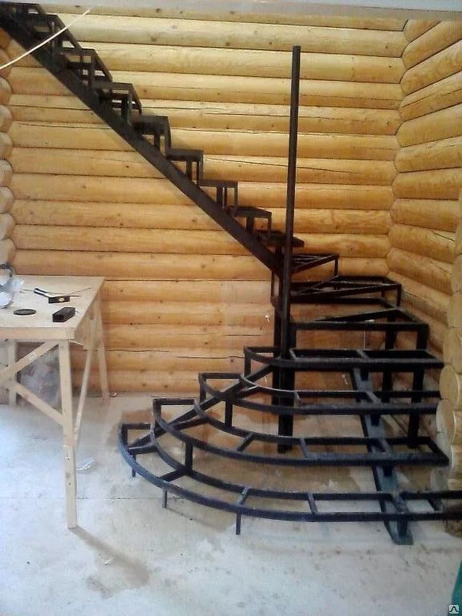 Сборка лестницы на металлическом каркасе начинается с установки несущих балок, но установить их практически невозможно, не изготовив предварительно переходную площадку. В принципе, обойтись без нее можно, но только в том случае, если речь идет о лестнице на одной несущей балке — тогда ее придется изготовить полностью, со всеми возможными и невозможными поворотами, при этом тщательно рассчитав угол наклона каждого ее элемента.