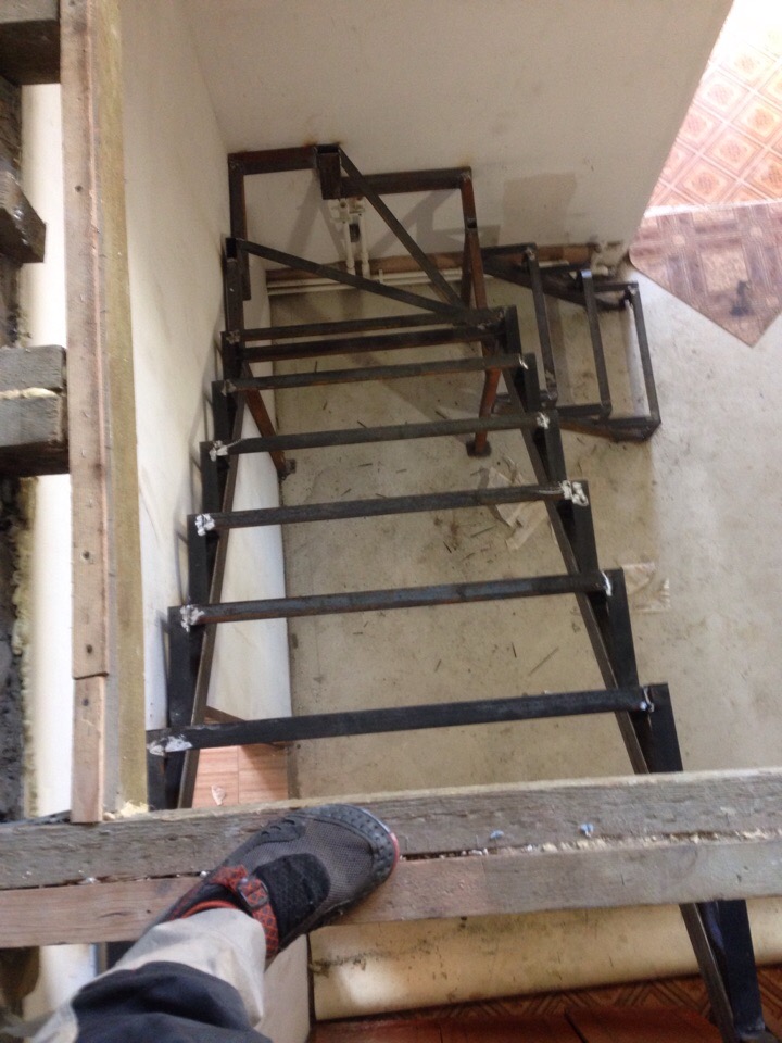 В принципе, на этом этапе работ изготовление каркаса можно считать законченным, а вот монтаж металлической лестницы нет.