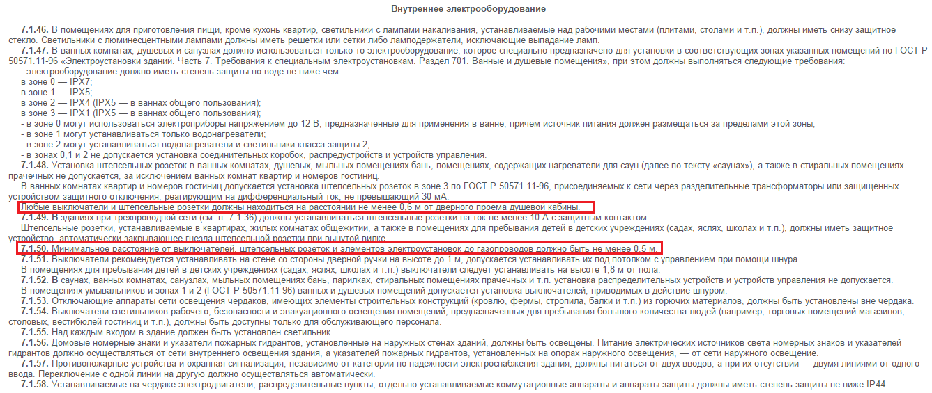 В СП 31-110-2003 имеется рекомендации того, что выключатели желательно размещать со стороны дверной ручки на высоте до 100 см, а розетки – в любом месте на таком же расстоянии. Согласно ПУЭ (Правила Устройства Электроустановок) розетки и выключатели должны располагаться дальше, чем в 50 см от газопровода, и дальше, чем в 60 см от ванны, раковины, душевой кабинки.