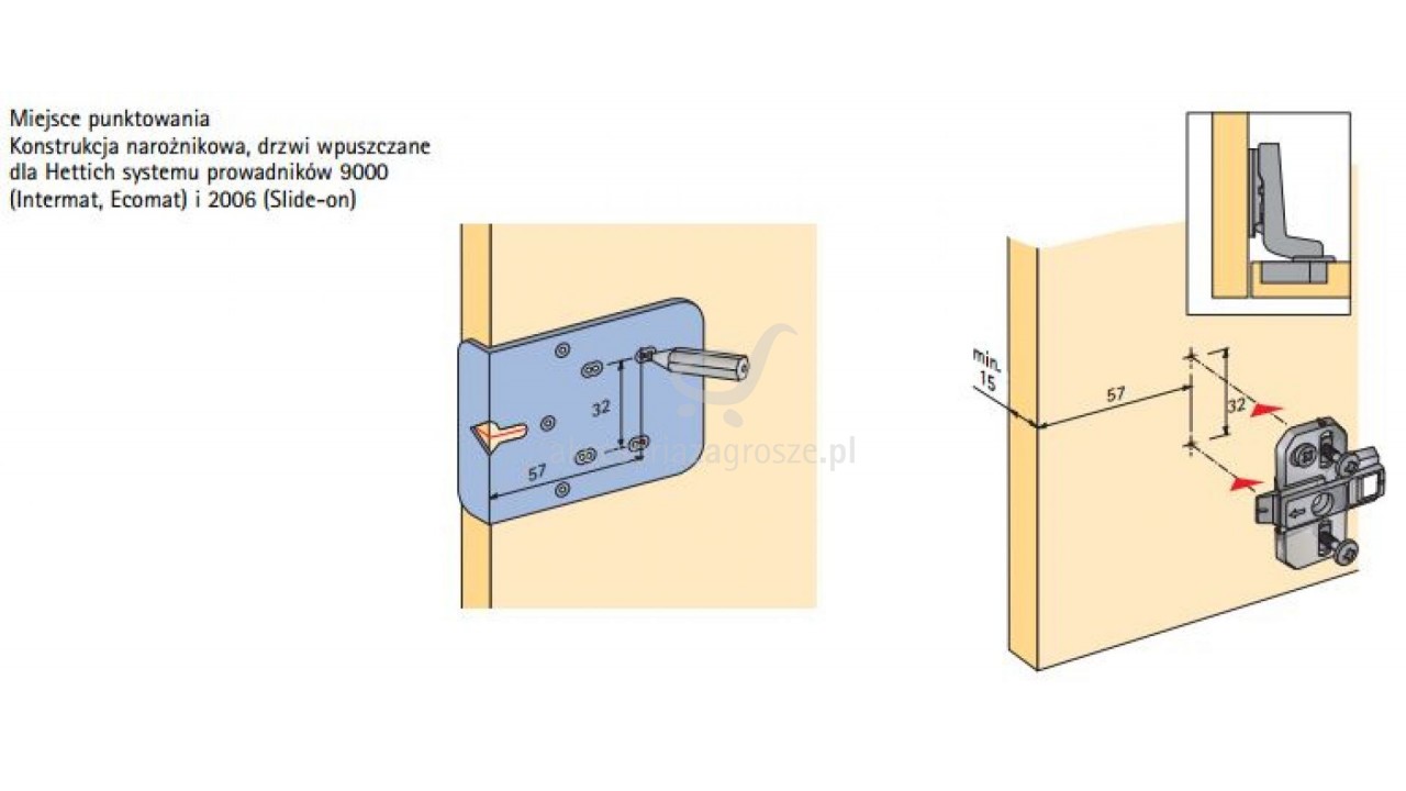 Монтажная планка System 9000 для петель Intermat и Ecomat Монтажная планка System 9000/угловая ответная планка для Intermat Артикул Расстояние Расстояние № для заказа. Линия отверстий PU 50 PU 400 Привинчиваемая монтажная пластина для крыла «Hettich Top» для полного наложения подходит для боковых стенок толщиной 15 мм и более со специальными предустановленными винтами и пластиковыми втулками для сверления ø 5 x 12 мм отверстий Эксцентриковая регулировка высоты ±2 мм, никелирование/цинковое литье под давлением Монтажные пластины InLine с запрессовкой Расстояние между отверстиями 32 мм забивная версия для отверстий диам.Параллельный эксцентрик 10 x 11,5 мм, регулировка высоты ±2 мм, никелированная сталь/*цинковое литье под давлением Угловая пластина для монтажной пластины створки серебристо-серый пластик Угловые пластины можно использовать только с винтами на монтажных пластинах створки: Дистанционная прокладка для створки монтажная пластина Серебристо-серый пластик Упак.