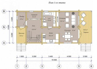 - Например, для варианта 6х6 кв. м на первом этаже размещается кухня, ванная комната и гостиная, которая занимает большую площадь, в ней располагается лестница на мансарду и выход на террасу.