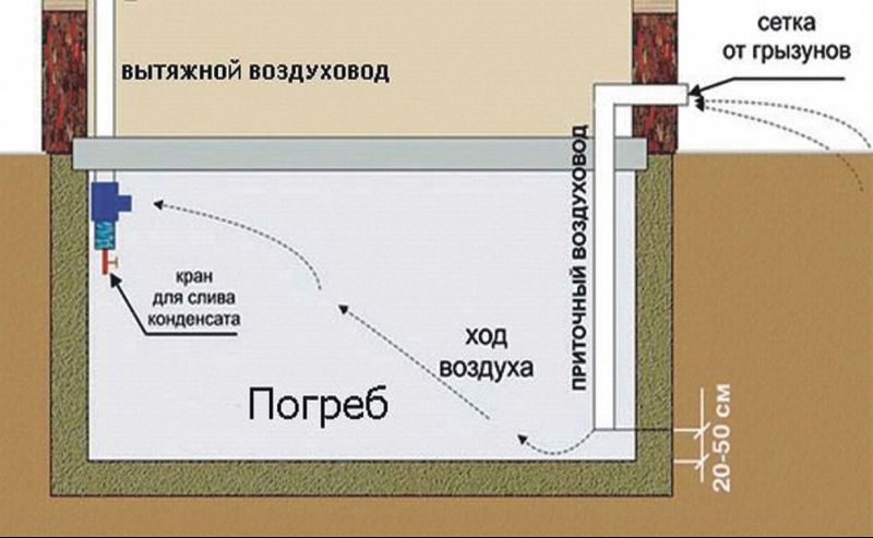 Благодаря приточной трубе к погребу будет постоянно поступать свежий воздух, а через вытяжную будут выходить токсичные и ядовитые вещества, а также скопившийся отработанный влажный воздух.