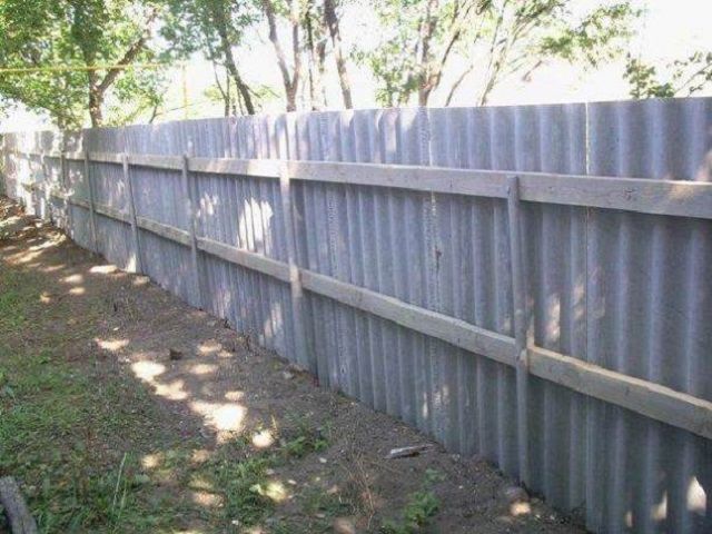3. Забор из старого серого волнового шифера асбестоцементного марки СВ-40 размером 1750×1130×5,2мм 7 волнового или 8 волнового, это не важно, который был снят с крыши и был использован на забор на огород, в принципе такой вариант хорош тем, что такой забор из волнового шифера очень и очень дешев, да что там говорить, он практически ничего не стоит.