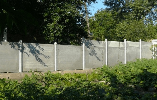 Забор из плоского шифера из листов асбестоцементных или ацэида размером 3000×1500×8мм. Представлен конструктивно простой забор, может не совсем эстетичный, но зато дешевый и практичный. Столбы в этом варианте внутренние и спрятаны внутри участка. От столбов сделаны рейки и на них саморезами прикреплены шиферные листы.