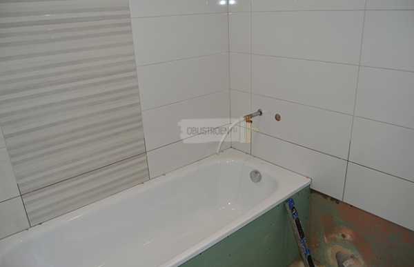 Далее обкладываем кафелем нишу из влагостойкого гипсокартона под ванну. Расчерчиваем место под ревизионный люк и подгоняем под него плитку.
